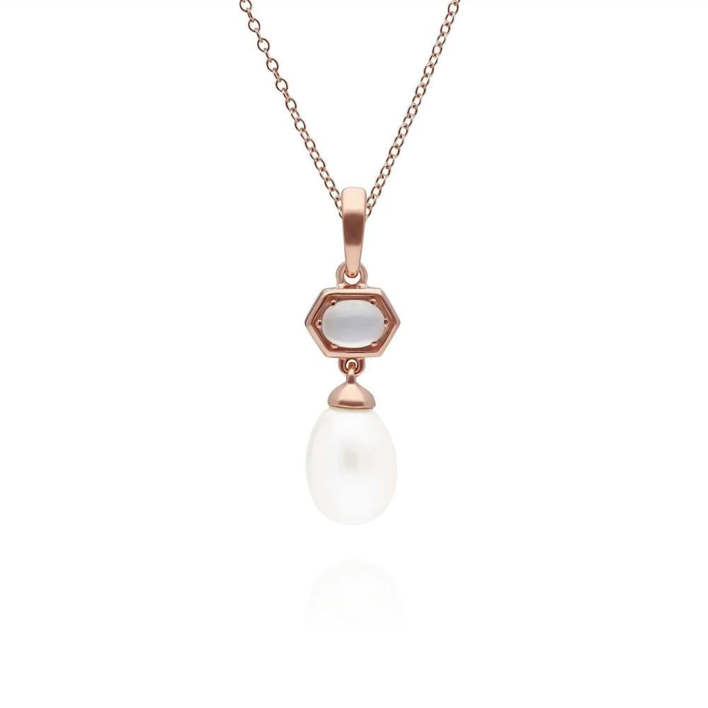 An elegant and contemporary drop pendant featuring an oval moonstone cabochon with a dangling pearl. This pendant is suspended on a matching rose gold plated sterling silver chain.