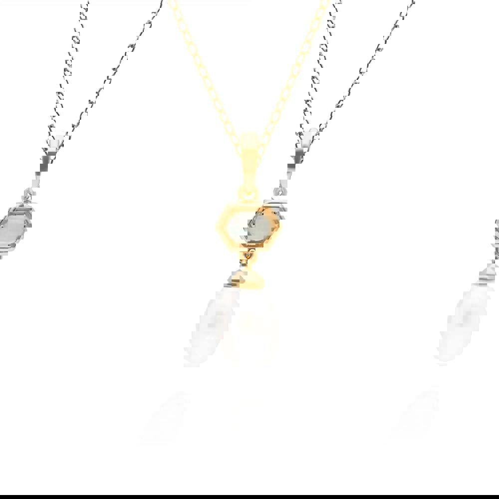 An elegant and contemporary drop pendant featuring an oval opal cabochon with a dangling pearl. This pendant is suspended on a matching gold plated sterling silver chain.