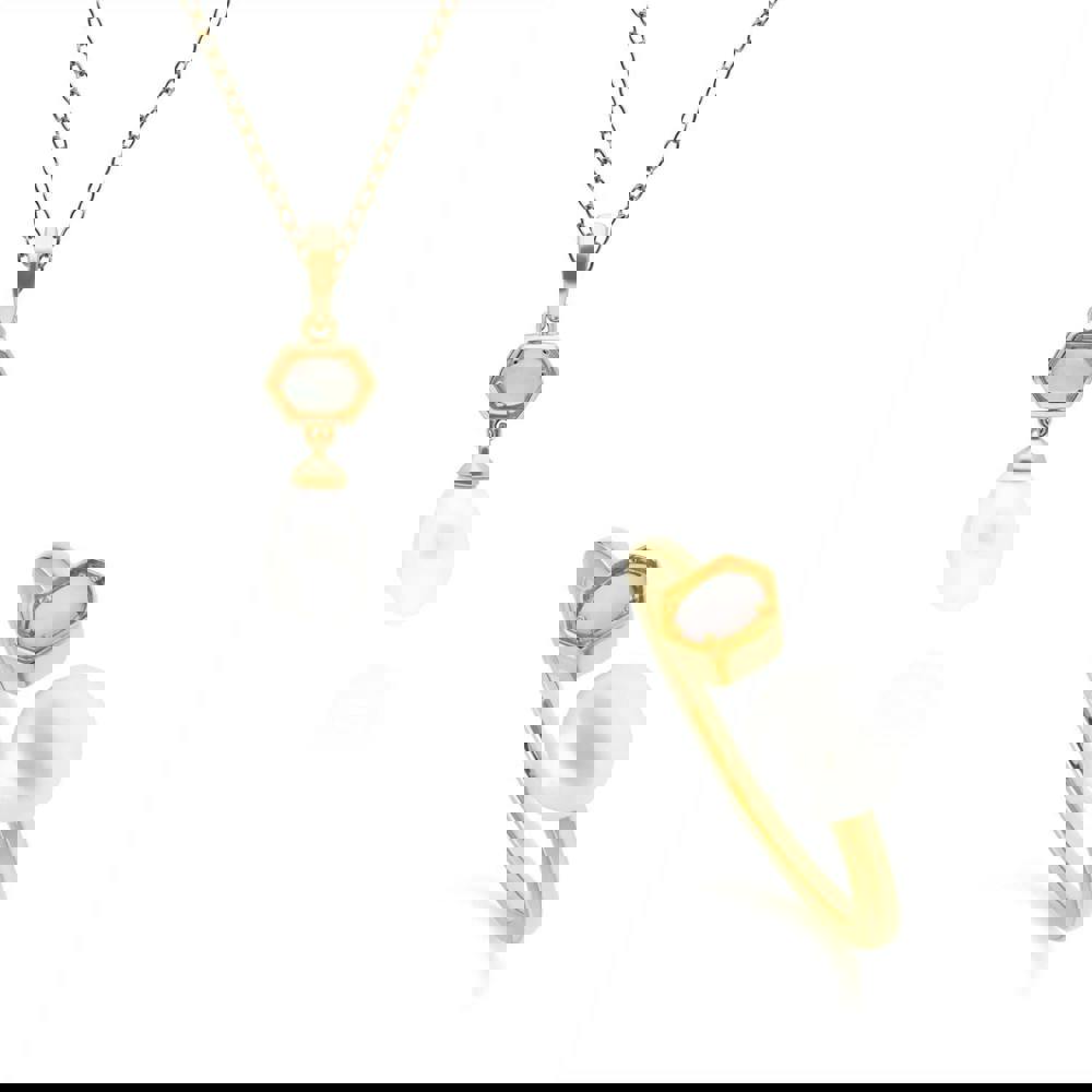 A contemporary gold plated sterling silver pendant and open ring set with cultured freshwater pearls and opal gems. This pendant is suspended from a matching gold plated sterling silver chain.