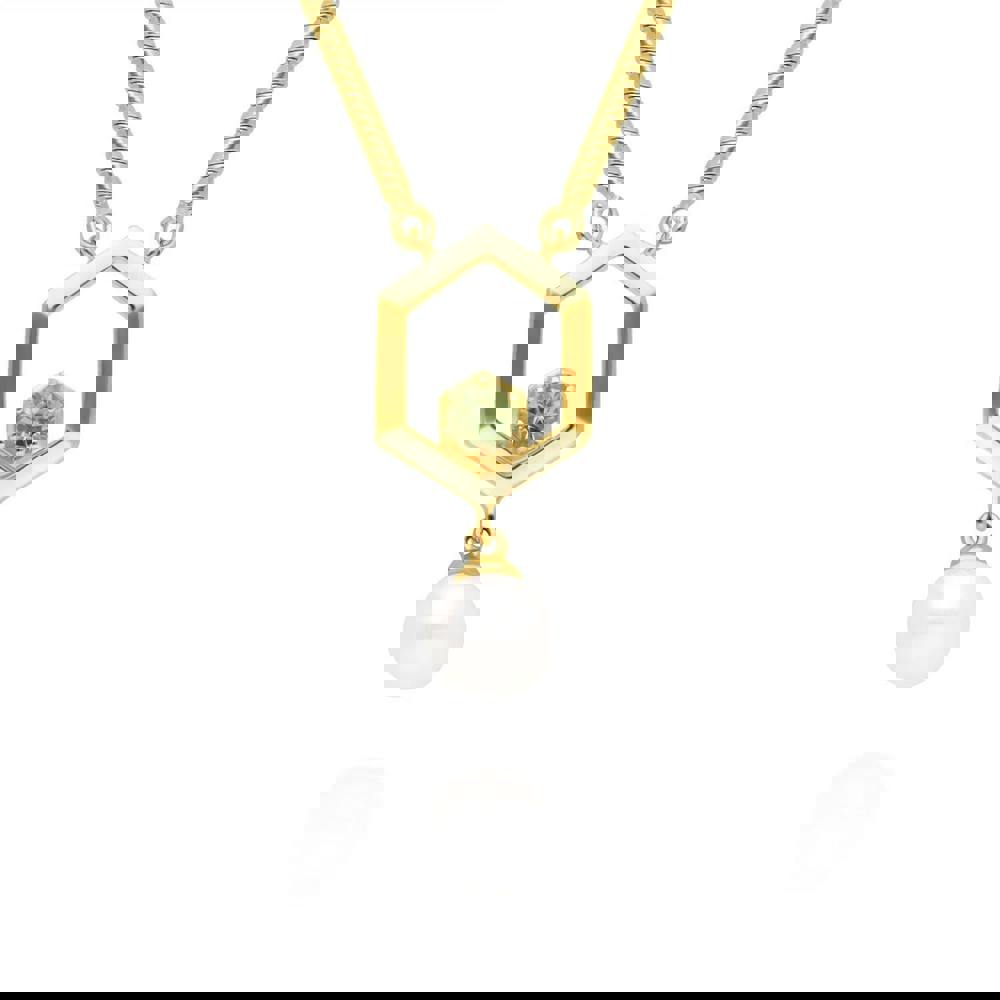 A beautiful sterling silver necklace on a snake chain plated in warm yellow gold, featuring a single hexagon showcasing a green peridot gemstone and a dangling cultured freshwater pearl.