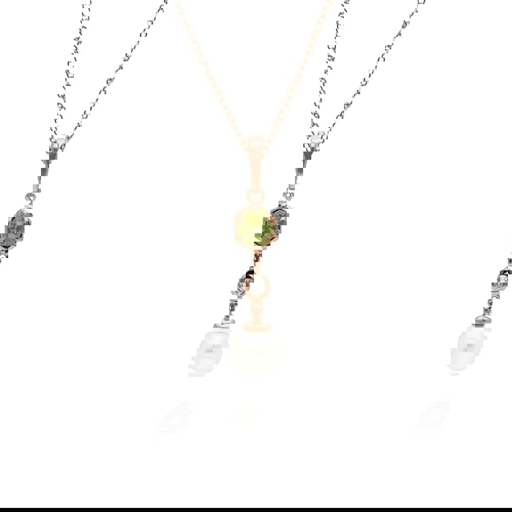A chic and contemporary drop pendant with a cultured freshwater pearl that dangles beautifully from a geometric setting decorated with a green peridot and white topaz. This pendant is suspended on a matching rose gold plated sterling silver chain.