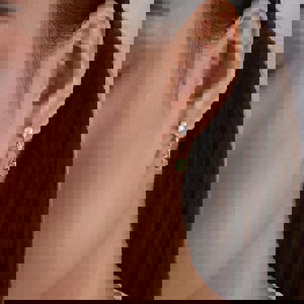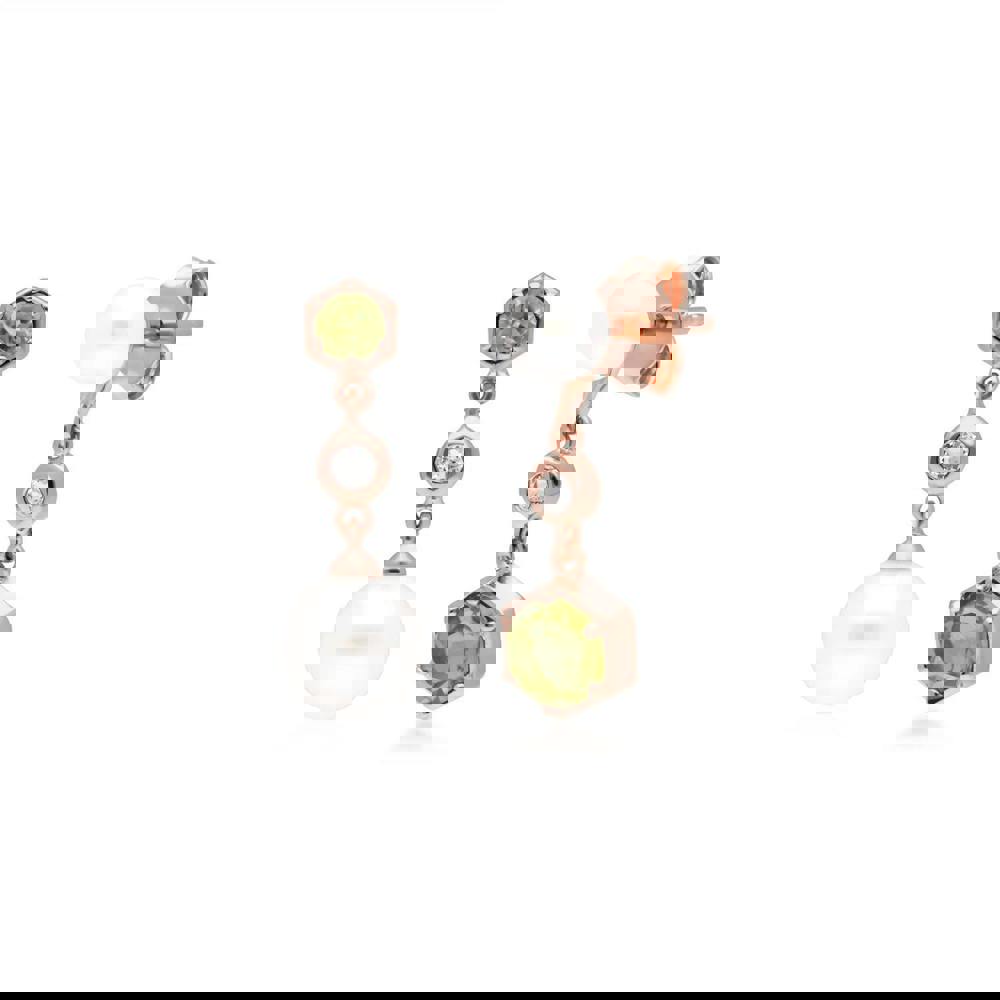 A pair of playful rose gold plated 925 sterling silver drop mismatched earrings with freshwater pearls that dangle with green peridot and white topaz gemstones in sleek geometric settings. These earrings have a post and butterfly backs and are suitable for pierced ears only.