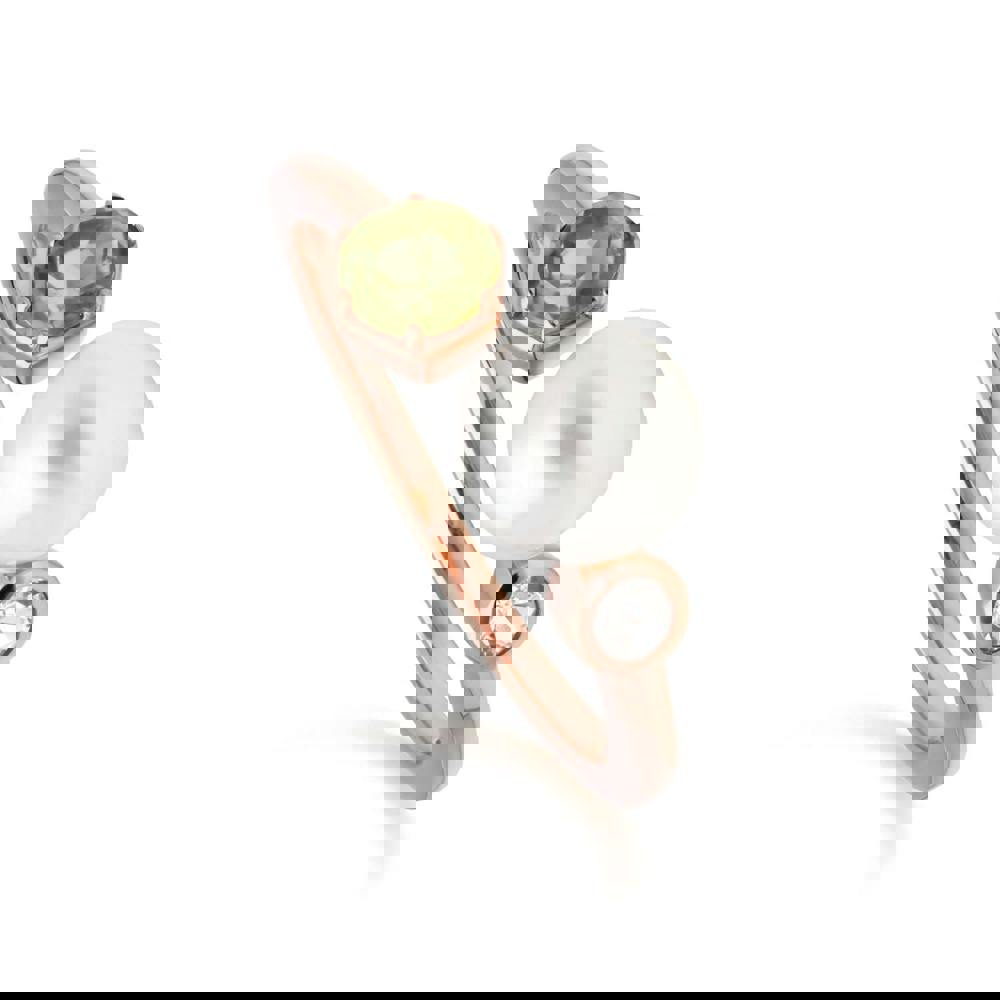 An elegant and contemporary rose gold plated open ring featuring a round pearl, a green peridot and sparkling white topaz.
