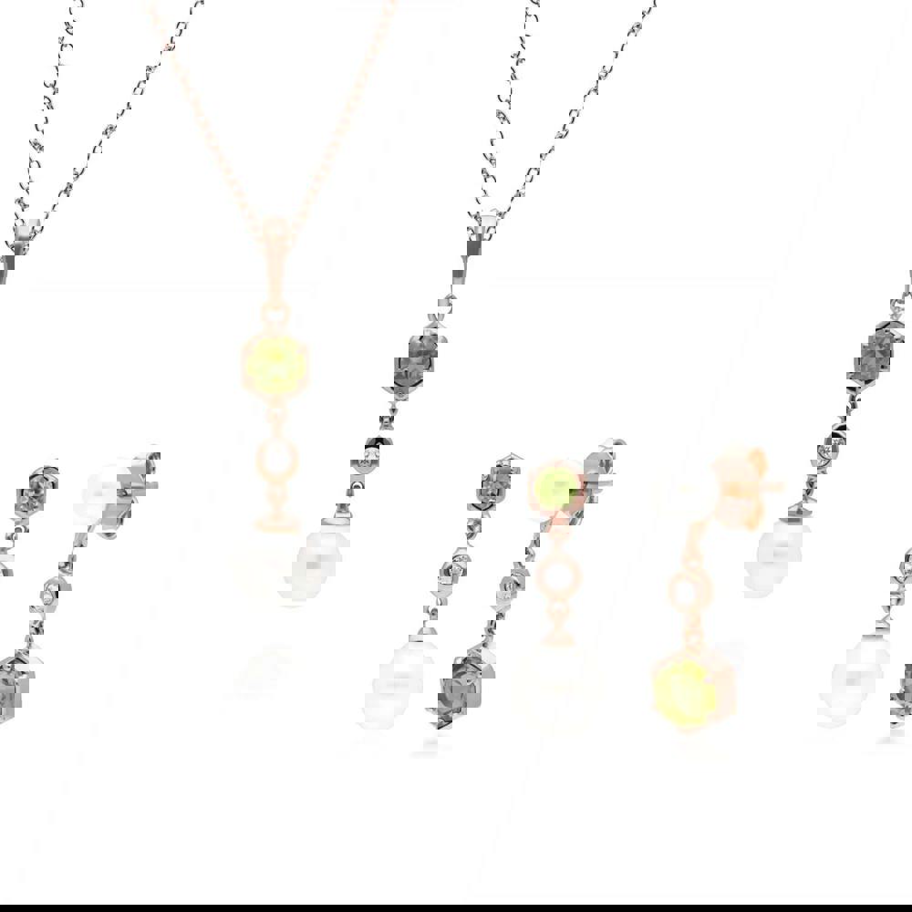 A chic and contemporary drop pendant and earring set with cultured freshwater pearls and geometric settings decorated with green peridot and white topaz. This pendant is suspended on a matching rose gold plated sterling silver chain and these earrings feature a post and butterfly back for pierced ears.