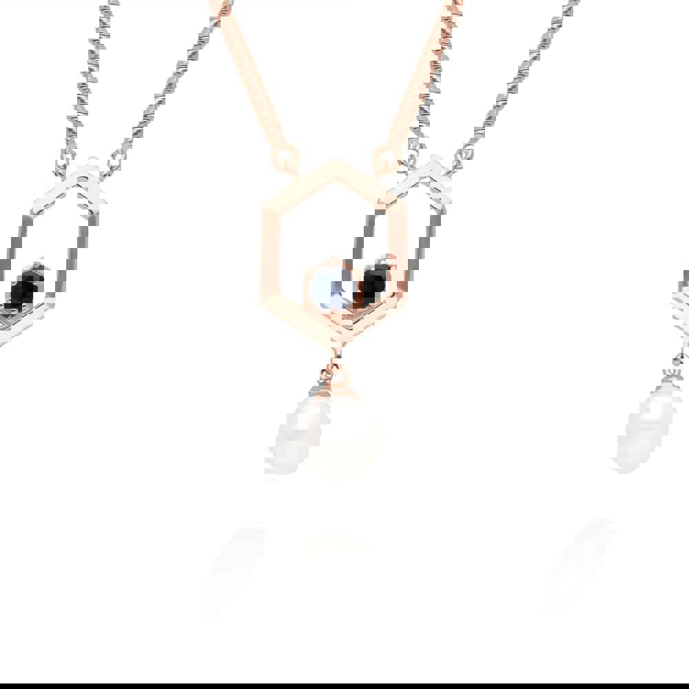 A beautiful sterling silver necklace plated in stunning rose gold, featuring a single hexagon showcasing a central sapphire with a dangling pearl.