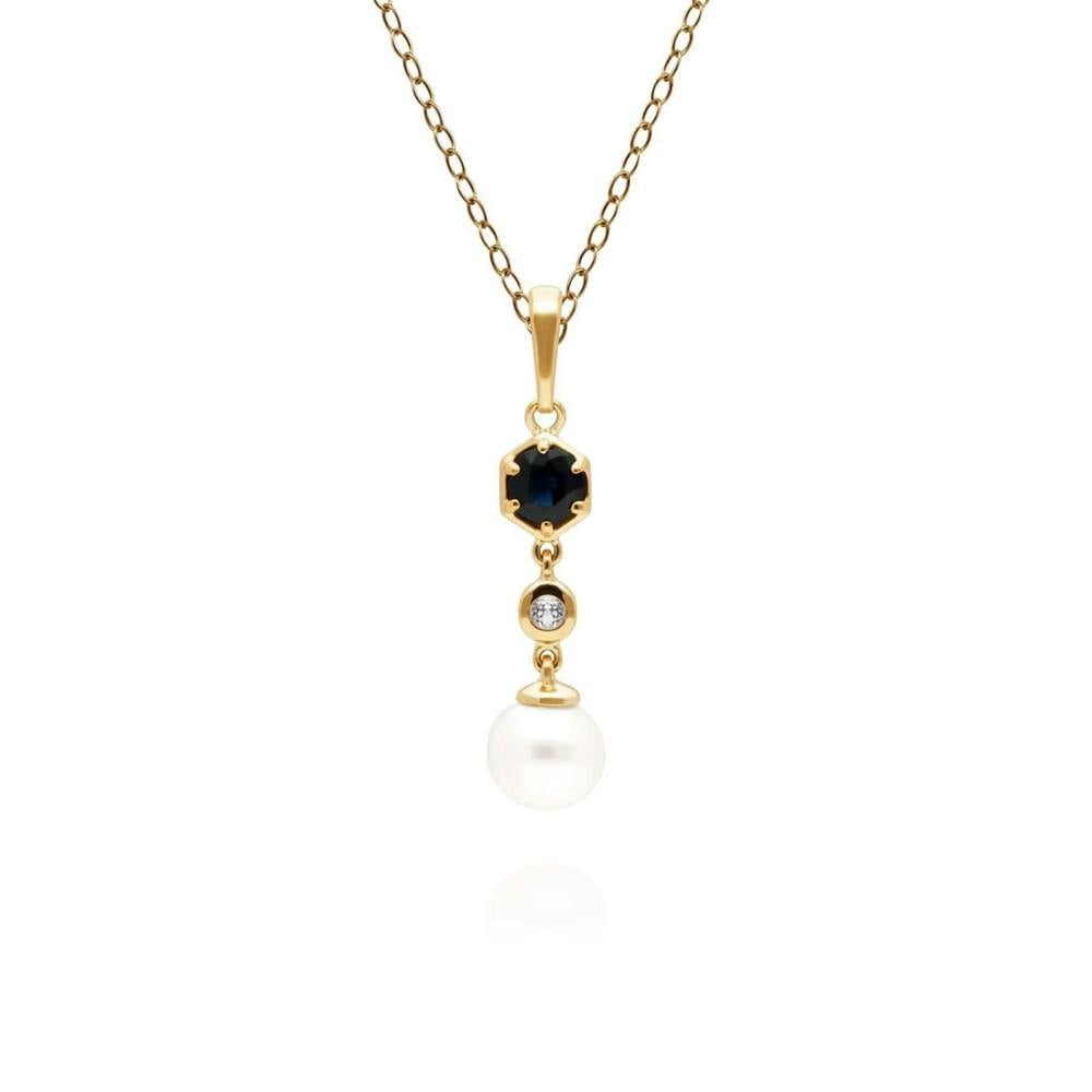 A chic and contemporary drop pendant with a cultured freshwater pearl that dangles beautifully from a geometric setting decorated with blue sapphire and white topaz. This pendant is suspended on a matching yellow gold plated sterling silver chain.