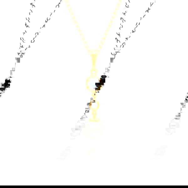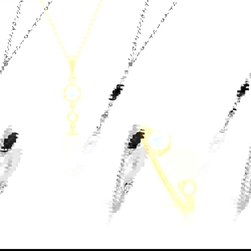 A chic and contemporary drop pendant and ring jewellery set with a cultured freshwater pearl that dangles beautifully from a geometric setting decorated with blue sapphire and white topaz. This pendant is suspended on a matching yellow gold plated sterling silver chain.
