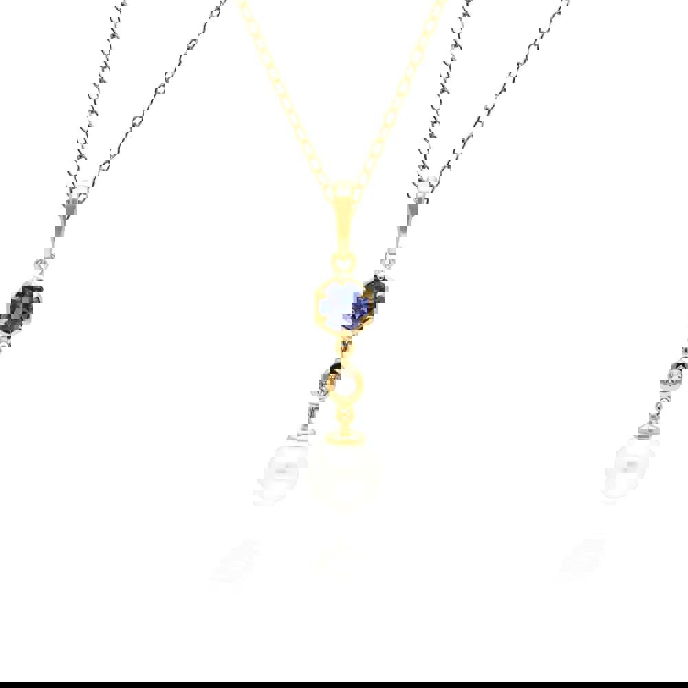 A chic and contemporary drop pendant with a cultured freshwater pearl that dangles beautifully from a geometric setting decorated with tanzanite and white topaz. This pendant is suspended on a matching yellow gold plated sterling silver chain.