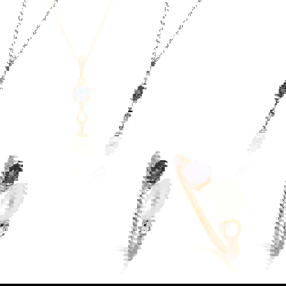 A chic rose gold plated 925 sterling silver ring and pendant set with freshwater pearls, tanzanite and white topaz gemstones in sleek geometric settings. This pendant is suspended from a matching rose gold plated sterling silver chain.