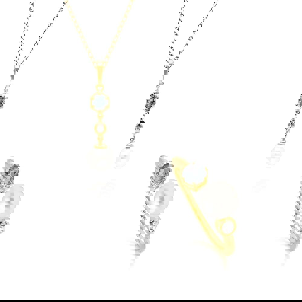 A contemporary gold plated sterling silver ring and pendant set with cultured freshwater pearls, topaz and aquamarine gems. This pendant includes a matching 45cm gold plated sterling silver chain.