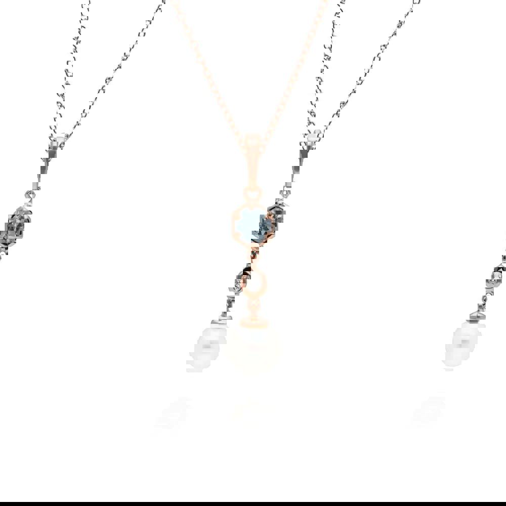 A chic and contemporary drop pendant with a cultured freshwater pearl that dangles beautifully from a geometric setting decorated with blue and white topaz gems. This pendant is suspended on a matching rose gold plated sterling silver chain.