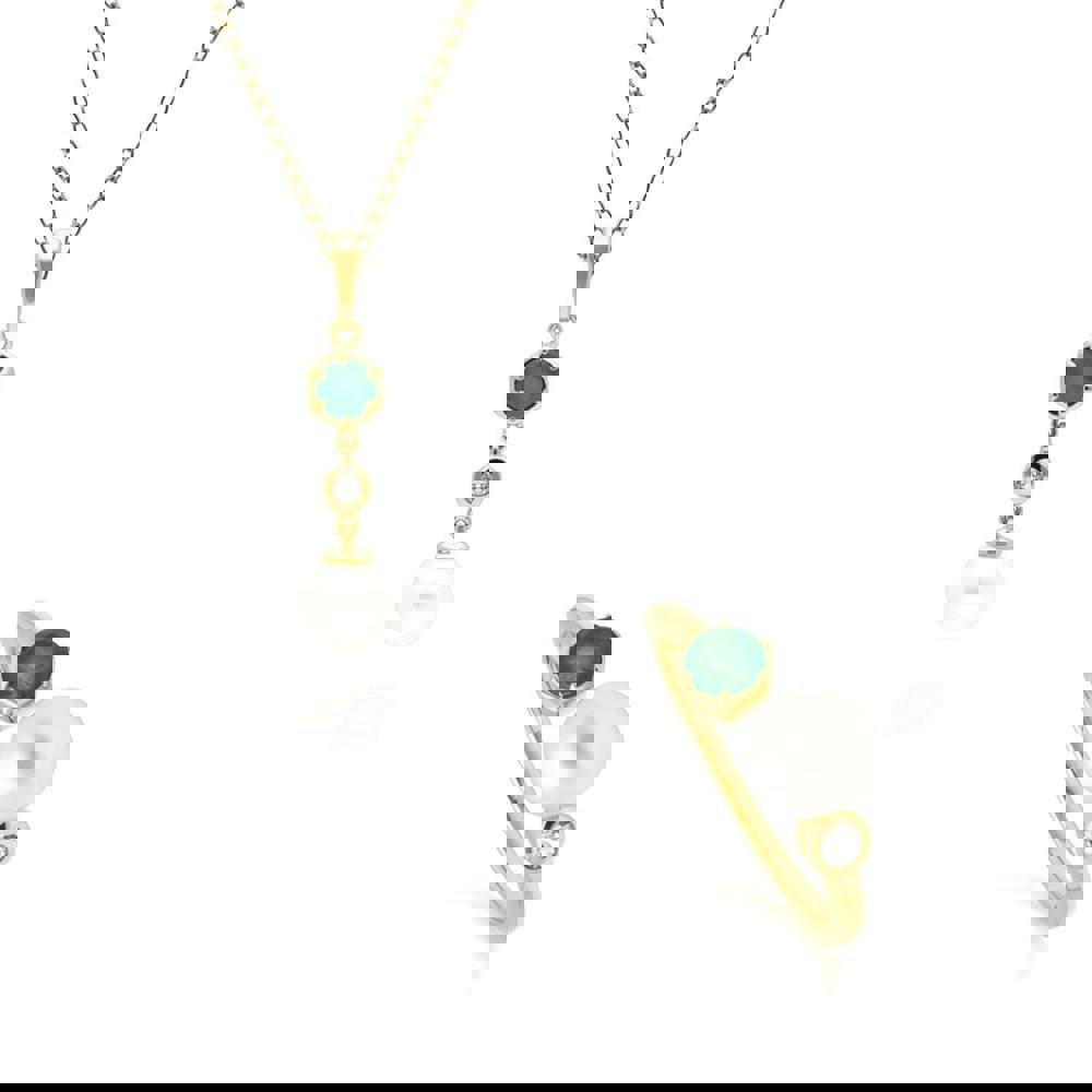 A contemporary gold plated sterling silver pendant and open ring set with cultured freshwater pearls, topaz and emerald gems. This pendant is suspended from a matching gold plated sterling silver chain.