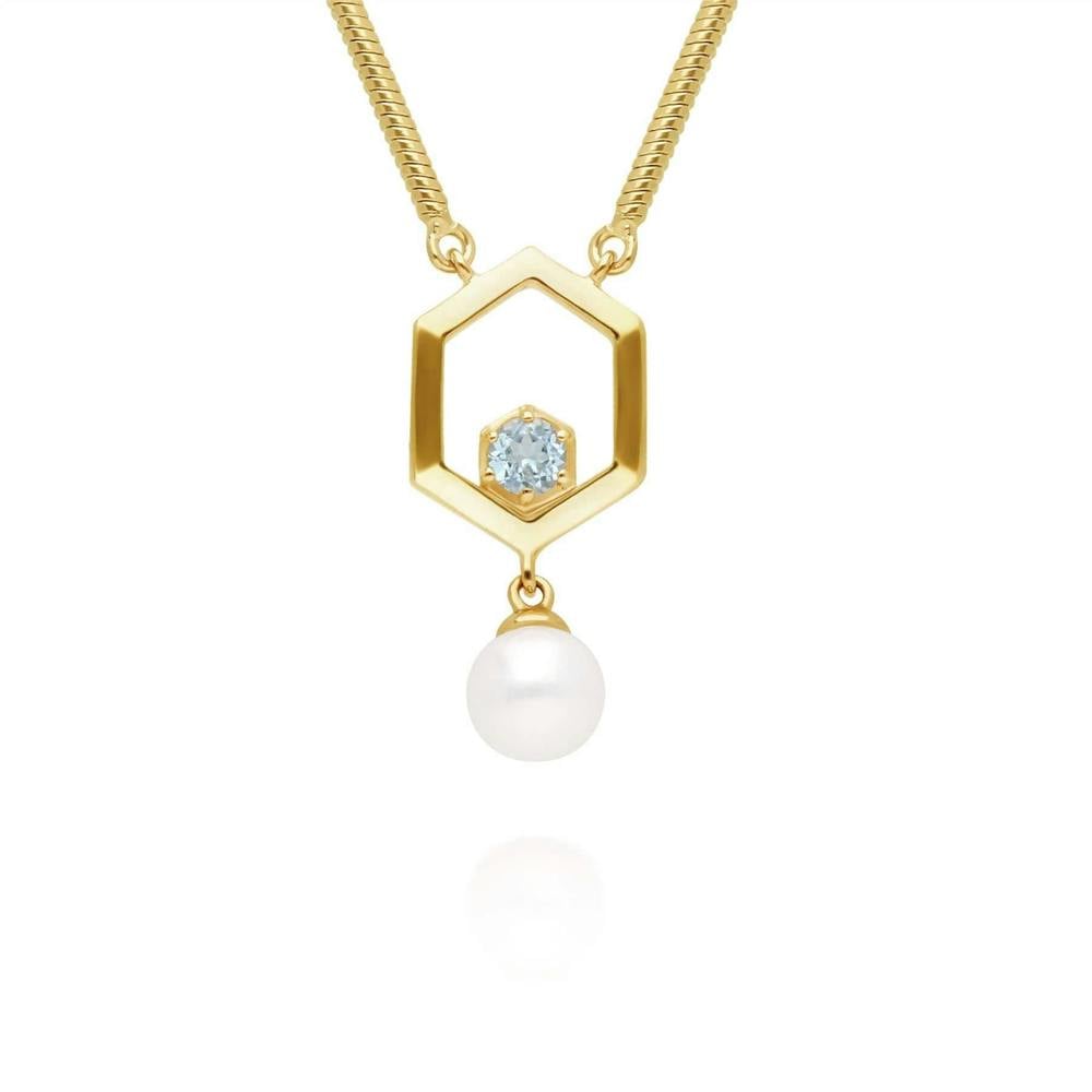 A beautiful sterling silver necklace on a snake chain plated in warm yellow gold, featuring a single hexagon showcasing a topaz gemstone and a dangling cultured freshwater pearl.