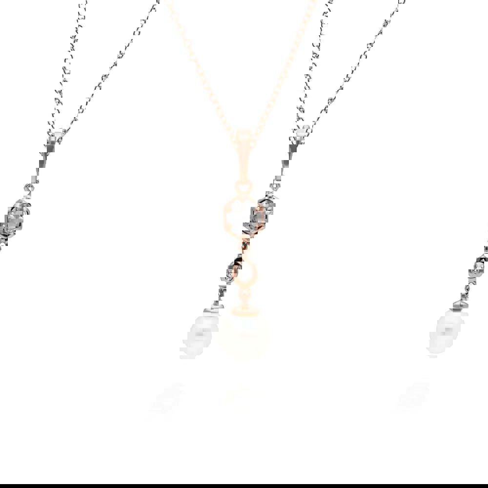 A chic and contemporary drop pendant with a cultured freshwater pearl that dangles beautifully from a geometric setting decorated with white topaz gems. This pendant is suspended on a matching rose gold plated sterling silver chain.
