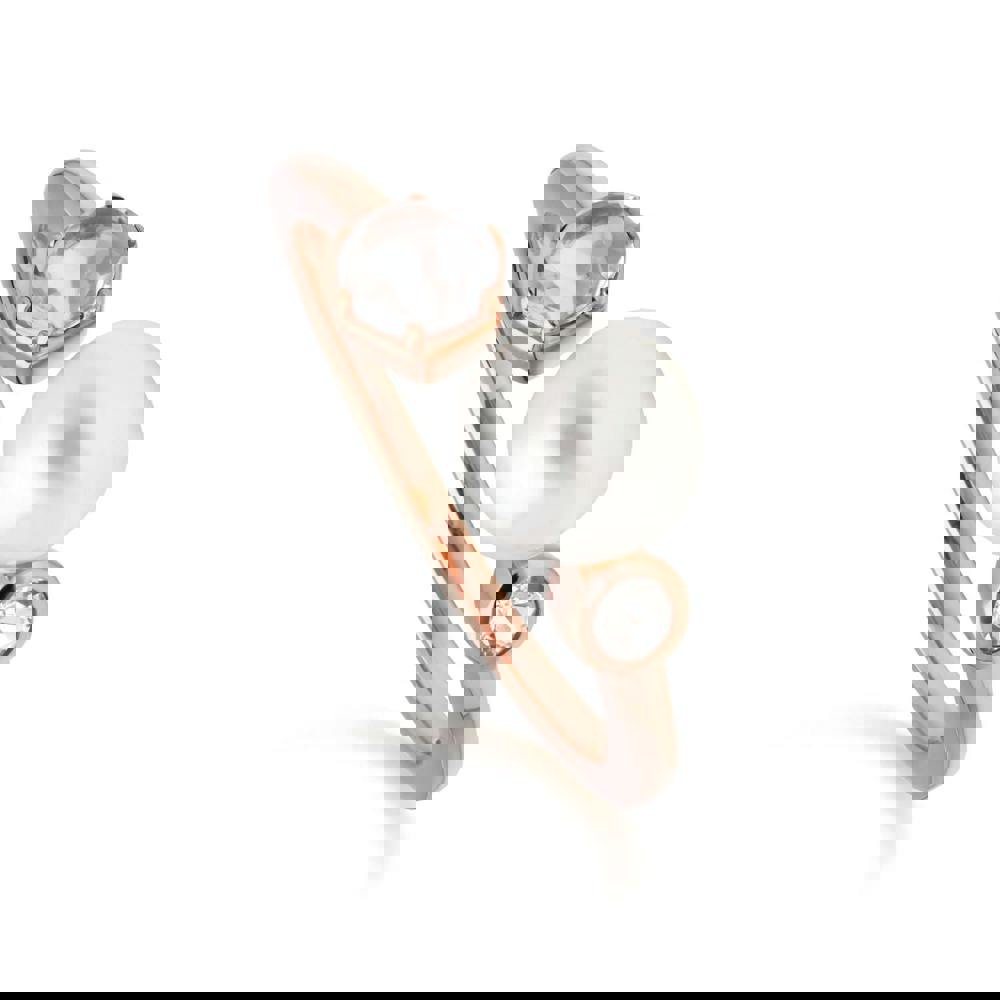 An elegant and contemporary rose gold plated open ring featuring a round pearl and sparkling white topaz gems.