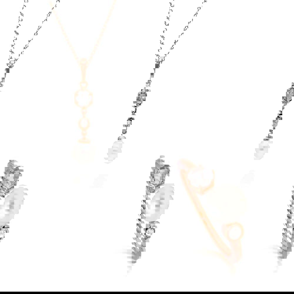 A chic and contemporary drop pendant and ring set with cultured freshwater pearls that dangle beautifully from geometric settings decorated with white topaz gems. This pendant is suspended on a matching rose gold plated sterling silver chain.