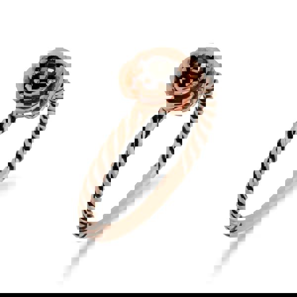 A cute rose gold plated sterling silver rope design ring featuring a flower with a round checkberboard marcasite gemstone inside.