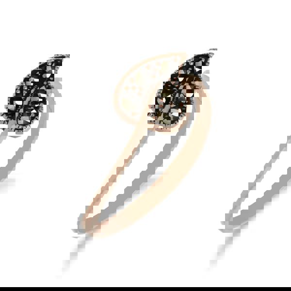 A beautiful rose gold plated sterling silver leaf design ring featuring round marcasite gemstones inside.