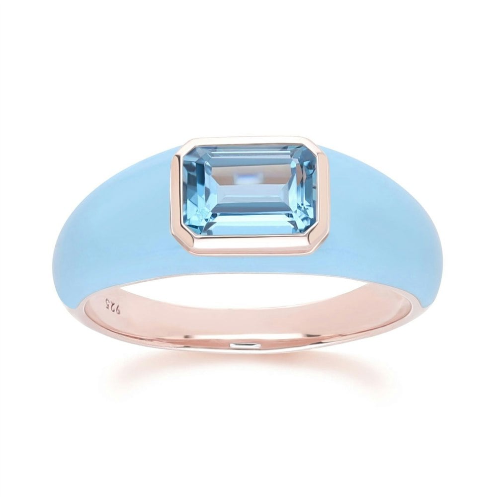 Radiant and elegant, the Siberian Waltz Blue Enamel & Octagon Sky Blue Topaz Ring in Rose Gold Vermeil features a striking octagon-cut sky blue topaz, exuding a serene and captivating beauty. Surrounded by vibrant blue enamel and set in warm rose gold vermeil, this ring creates a stunning contrast. Inspired by the graceful rhythm of a waltz, it embodies sophistication and charm—an exquisite statement piece for any occasion.