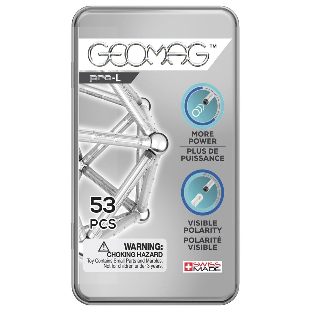 Experience the next level of magnetic construction with the Geomag Pro-L Pocket Set 53 Pieces. This advanced set features stronger magnets and rods with visible polarity indicators, allowing for more complex and robust creations. Designed for builders seeking greater challenges, the Pro-L series encourages exploration of advanced engineering and physics principles. The Geomag Pro-L Pocket Set 53 Pieces comes in a convenient metal tin, making it perfect for on-the-go creativity or as a compact starter set for the Pro-L system. It’s an ideal choice for older children and adults who enjoy sophisticated model building.