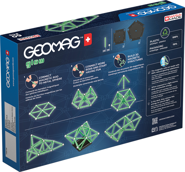 Build amazing structures that come to life in the dark with the Geomag Glow Recycled 60 Pieces Set. This innovative kit features magnetic rods that naturally glow in the dark after being exposed to light, combined with classic steel spheres for limitless construction possibilities. Made from 100% recycled plastic, it offers an eco-friendly way to play. The Geomag Glow Recycled 60 Pieces Set allows children to explore magnetism and geometry by day, then marvel at their glowing creations by night. Three storage boxes are included for easy organisation.