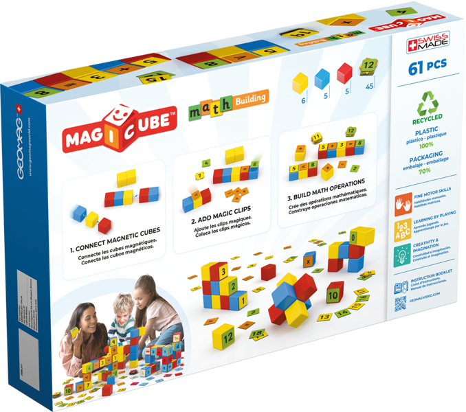 Make learning numbers and basic maths an engaging, hands-on experience with the Geomag Magicube Math Building Set 61 Pieces. This clever set includes 16 magnetic cubes that connect on all sides, along with 45 “Magic Clips” featuring numbers and mathematical symbols. Young children can attach the clips to the cubes to practice counting, simple addition, subtraction, and number recognition. The Geomag Magicube Math Building Set 61 Pieces transforms early numeracy into interactive fun, with the magnetic cubes made from 100% recycled plastic. It’s a fantastic screen-free way to build foundational maths skills.
