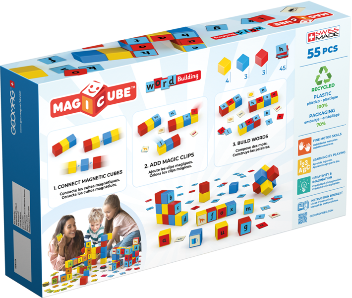 Introduce early literacy skills in a fun, hands-on way with the Geomag Magicube Word Building Set 55 Pieces. This engaging kit features 10 magnetic cubes that connect on all sides, complemented by 45 “Magic Clips” displaying letters and pictures to help children construct their first words. Young learners can match pictures to letters, spell out simple words, or freely explore letter combinations, making vocabulary development an interactive game. The Geomag Magicube Word Building Set 55 Pieces is a wonderful screen-free educational tool, with cubes made from 100% recycled plastic.