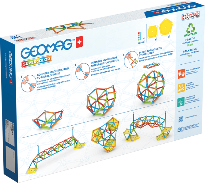 Build vibrant and imaginative structures with the Geomag Supercolor Recycled 142 Pieces Set. This extensive kit features powerful magnetic rods in a dazzling array of bright colours, along with non-magnetic steel spheres, offering limitless possibilities for 2D and 3D creations. Made from 100% recycled plastic, it combines eco-conscious play with colourful fun. The Geomag Supercolor Recycled 142 Pieces Set is designed to stimulate creativity, enhance spatial awareness, and introduce the fundamental principles of magnetism. Six handy storage boxes are included to keep all the colourful components neatly organised.