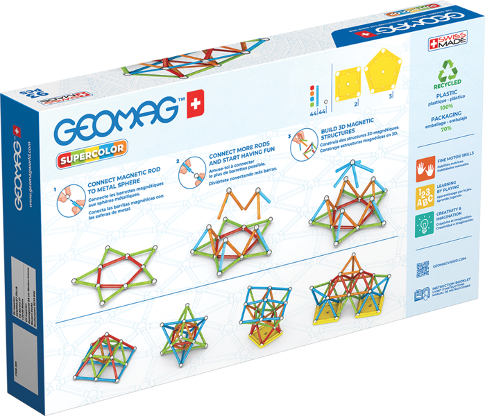 Construct brilliantly coloured creations with the Geomag Supercolor Recycled 93 Pieces Set. This engaging kit includes powerful magnetic rods in a variety of vibrant Supercolor shades and non-magnetic steel spheres, enabling builders to design countless 2D and 3D models. Crafted from 100% recycled plastic, it offers a sustainable approach to creative play. The Geomag Supercolor Recycled 93 Pieces Set helps develop spatial reasoning and an understanding of magnetic principles, all while providing hours of colourful fun. Four convenient storage boxes are included to keep the pieces tidy.