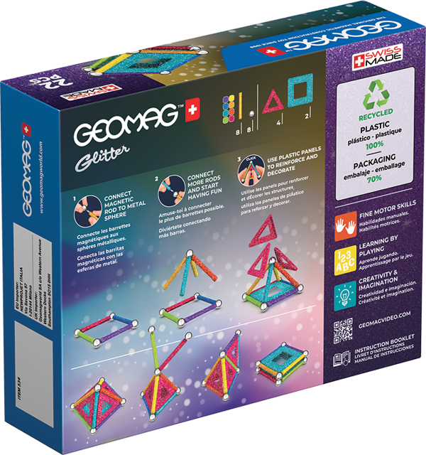 Introduce a touch of sparkle to early construction play with the Geomag Glitter Panels Recycled 22 Pieces Set. This charming kit features powerful magnetic rods, steel spheres, and vibrant glitter-infused panel pieces, perfect for creating dazzling small-scale 2D and 3D designs. Made from 100% recycled plastic, it offers a sustainable way to play. The Geomag Glitter Panels Recycled 22 Pieces Set is an ideal starter set for young builders, encouraging creativity and exploration of magnetic forces. It comes complete with a convenient storage box to keep the shimmering pieces tidy.
