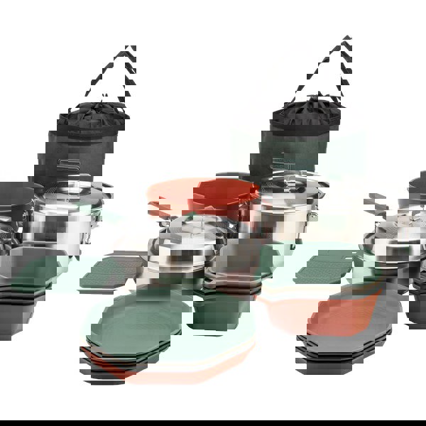 The 16-piece ComplEAT Cook Set has everything you need to easily feed a group of hungry campers. This camping cookware set features a stock pot and sauté pan with generous cooking surfaces and 3-ply base construction for even heat distribution. The tableware set assists during prep work and makes room for generous portions once the meal is ready. When campers are full, everything packs together in the storage bag for safe and compact storage between trips.