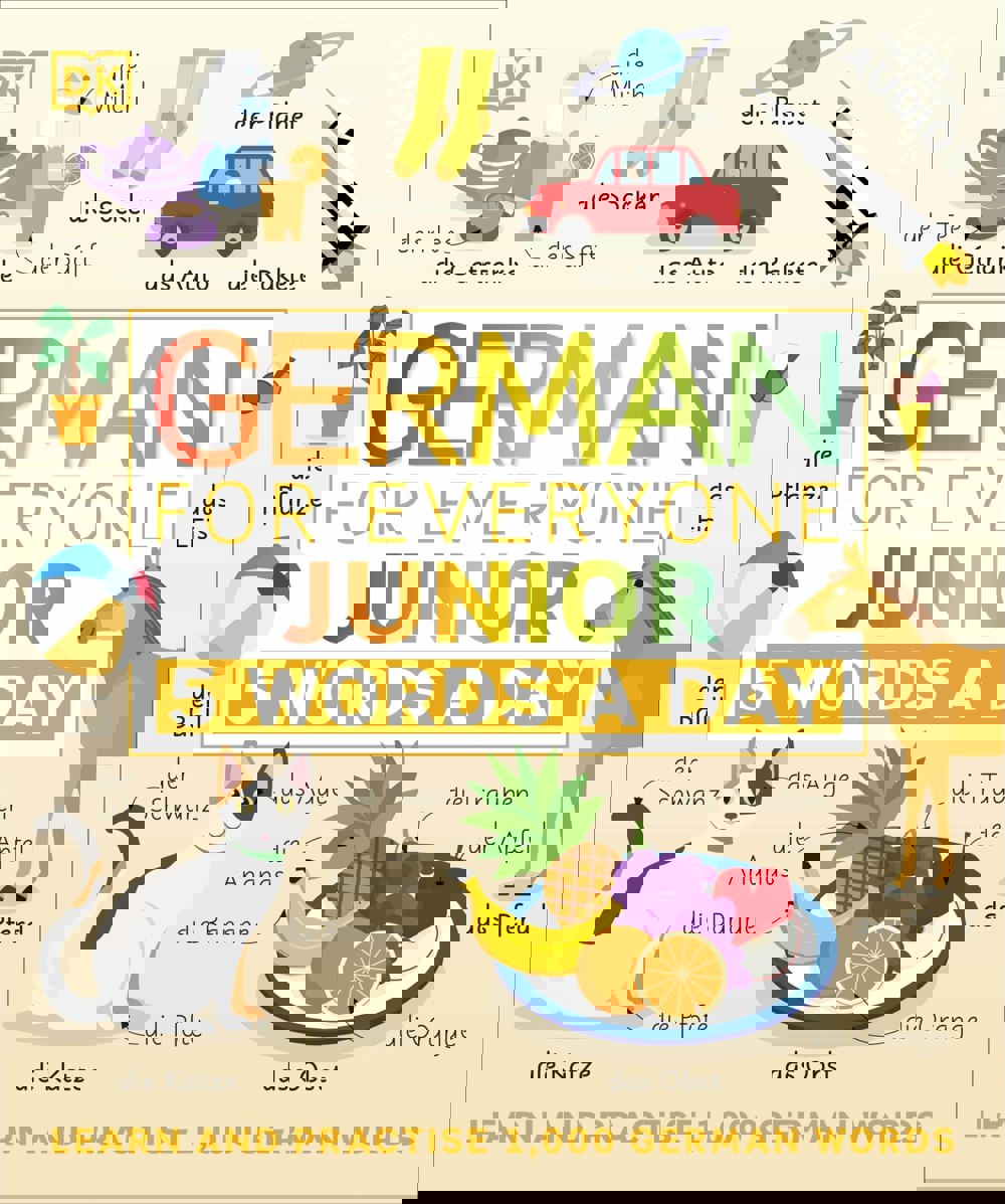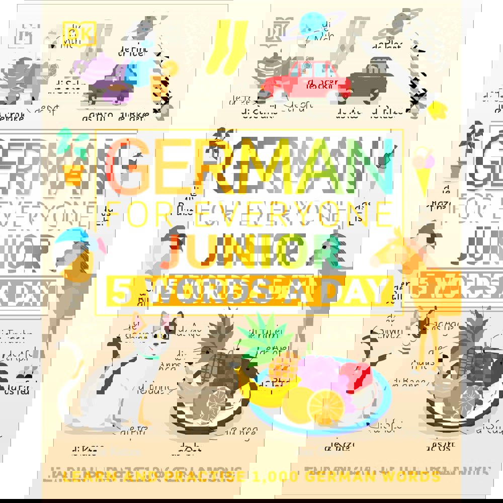 German for Everyone Junior 5 Words a Day: Learn and Practise 1,000 German Words is a German workbook for beginners designed to help children build vocabulary in small, manageable steps. Aimed at ages 6–9, it introduces new language through illustrated scenes that teach and test five words at a time.