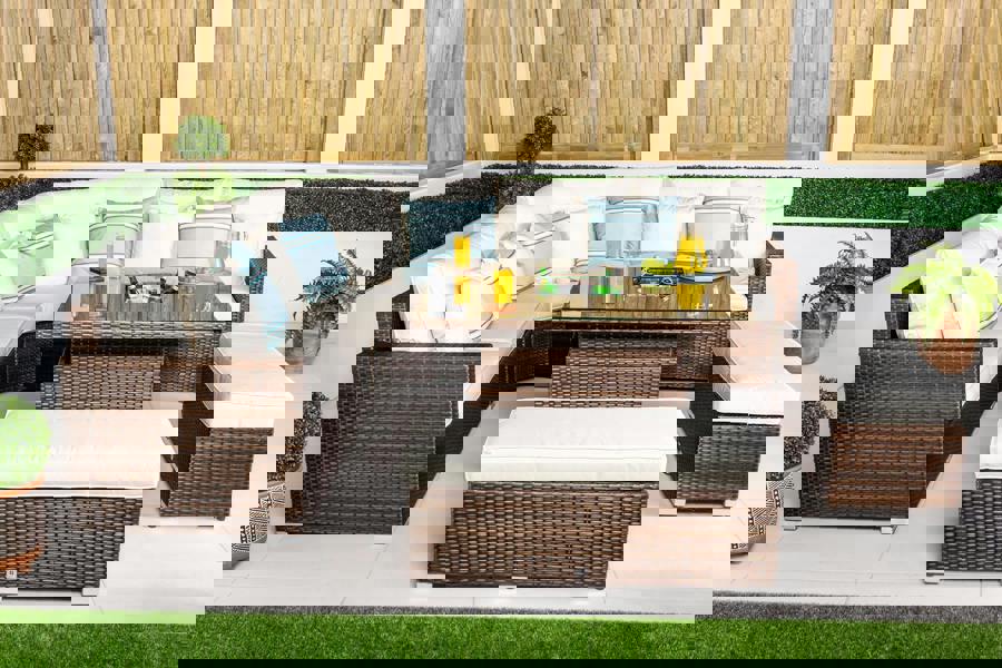 Designed for relaxed outdoor living and effortless entertaining, the Santorini luxury L-shaped outdoor sofa set is a stylish and versatile centrepiece for any modern garden or patio. This contemporary set features a spacious five-seat L-shaped sofa, two matching padded benches and a square height-adjustable coffee table with an integrated ice bucket drinks cooler.