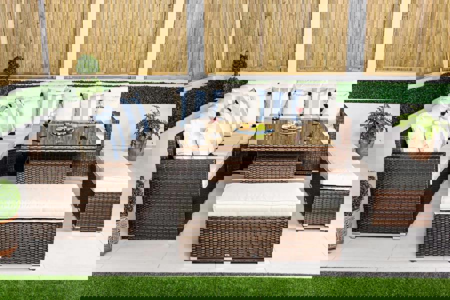 Designed for relaxed outdoor living and stylish entertaining, the Santorini luxury L-shaped outdoor sofa set is a refined and versatile addition to any modern garden or patio. With a spacious five-seat configuration, two matching padded benches and a square height-adjustable coffee table, this set delivers comfort, flexibility and contemporary design in one cohesive layout.