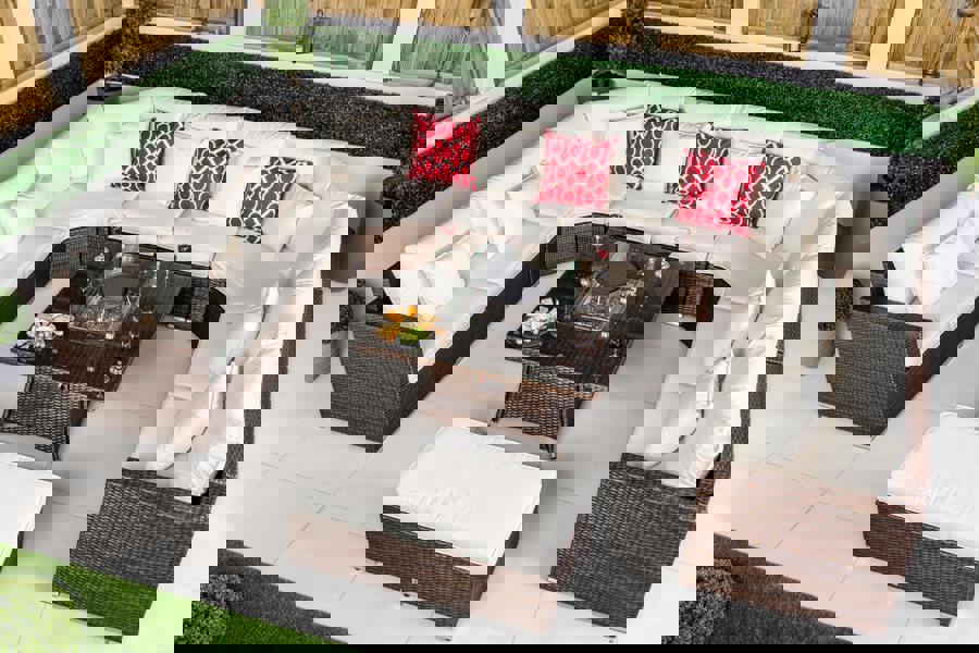 Designed to bring people together in comfort and style, the Santorini U-shaped outdoor sofa set creates a luxurious centrepiece for modern garden living. With eight modular seating sections, a matching padded bench and a statement square fire pit coffee table, this set delivers an inviting space for entertaining, dining and relaxing outdoors.