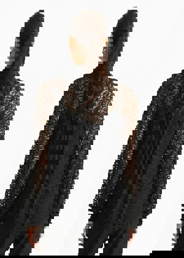 Elevate your everyday style with this Black Animal Lace Neck Tie Detail Blouse. Featuring a bold animal print lace neck tie, it adds a striking touch to a comfortable, casual fit. Perfect for making a confident statement while staying relaxed throughout your day.