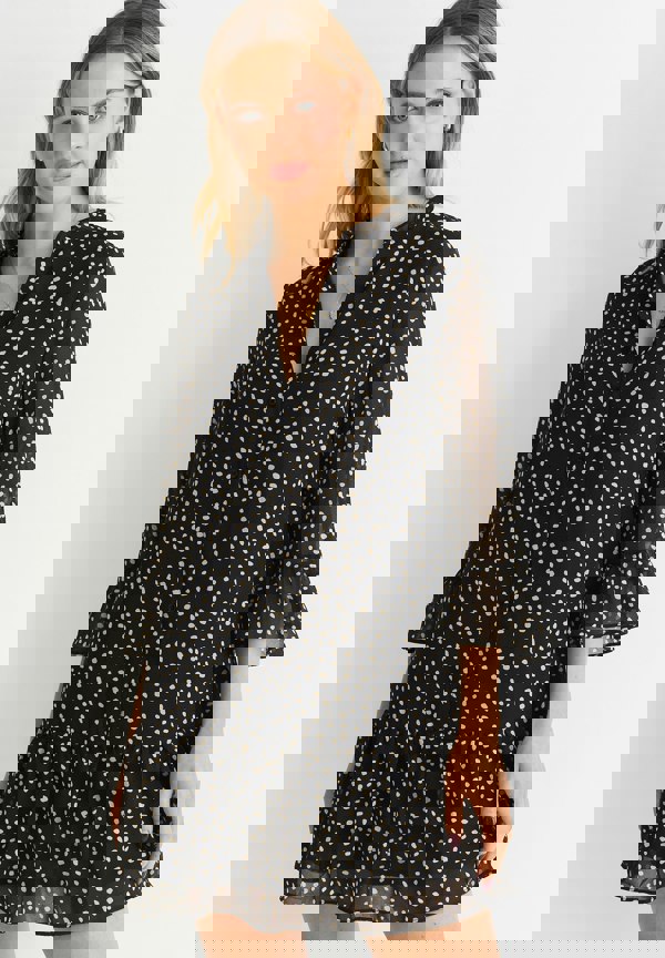 Indulge in the elegant and sophisticated style of our Black Animal Spot Shirt Mini Dress. This luxurious piece features a sleek and chic black animal spot print that exudes exclusivity. Crafted with premium quality fabric, it offers a comfortable fit while accentuating your curves. Elevate your wardrobe with this statement dress.