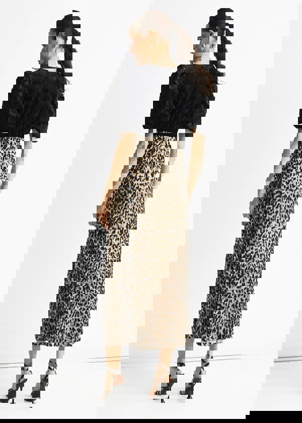 This Black Animal Velvet Contrast Top Occasion Midi Dress combines bold style with comfortable wearability. Featuring a striking velvet contrast top with an animal print detail, it offers a unique look perfect for casual outings or special occasions.