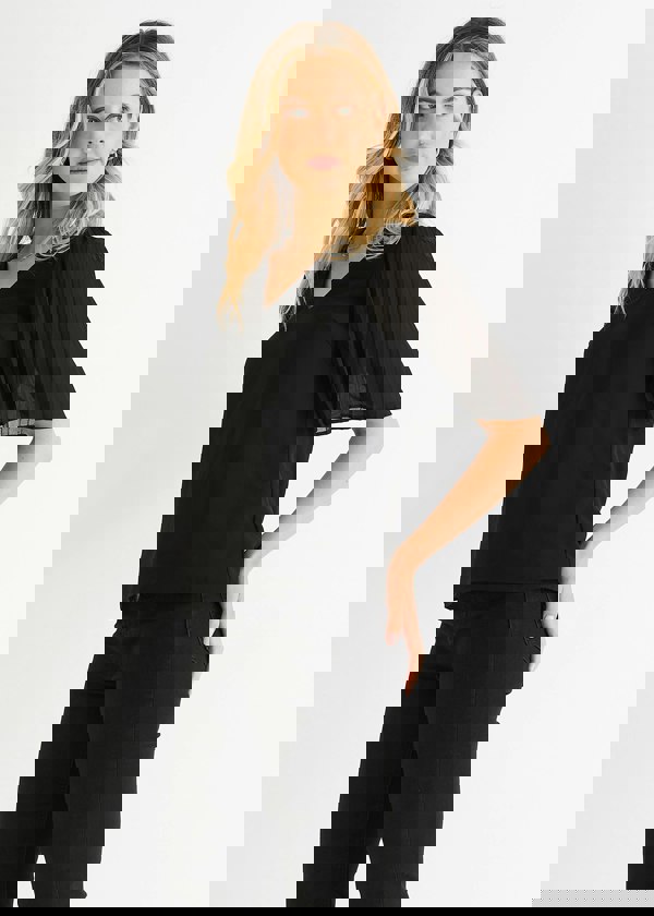 The Black Chiffon Pleat Sleeves V Neck Top offers a perfect mix of casual comfort and bold style. Its airy chiffon fabric and pleated sleeves create graceful movement, while the V-neck adds a flattering, confident touch. Ideal for everyday wear, this top keeps you comfortable and stylish with ease.