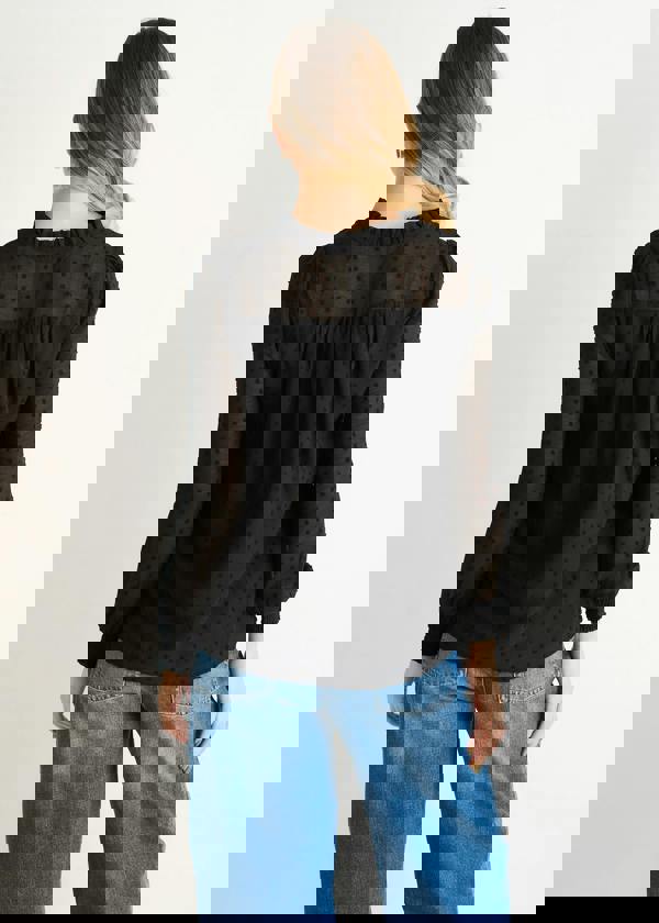 Elevate your everyday edit with this striking black dobby chiffon blouse. The delicate frill neck detail adds movement and personality, while the textured dobby weave brings subtle dimension to a timeless silhouette. Crafted from lightweight chiffon, it's breathable and effortless—perfect for layering or wearing solo.