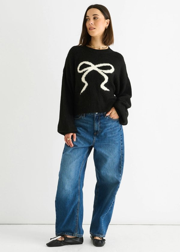 Stay stylish and comfortable with our Black Embossed Contrast Bow Short Knit Jumper. The black embossed design and contrast bow detail add a touch of style to this comfortable jumper. Perfect for a casual day out or a cozy night in, this jumper is a must-have in any wardrobe.