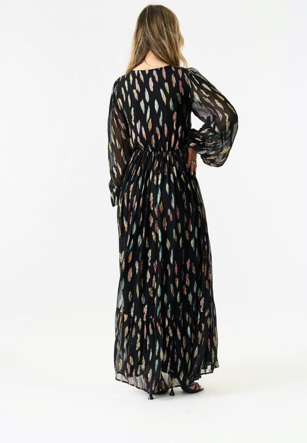 This Black Metallic Print Full Sleeve Maxi Dress is a must-have for the fashion-forward individual. The elegant design and metallic print add a touch of glamour to any outfit. The full sleeves provide both coverage and style, making it perfect for any occasion.