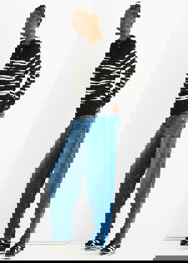 Embrace casual comfort with the Black Recycle Stripe Button Up Loose Fit Knit Jumper. Featuring a relaxed silhouette and bold stripe accents, this jumper offers effortless style and cozy warmth. Perfect for layering or wearing solo, it’s a standout piece that combines sustainability with everyday ease.