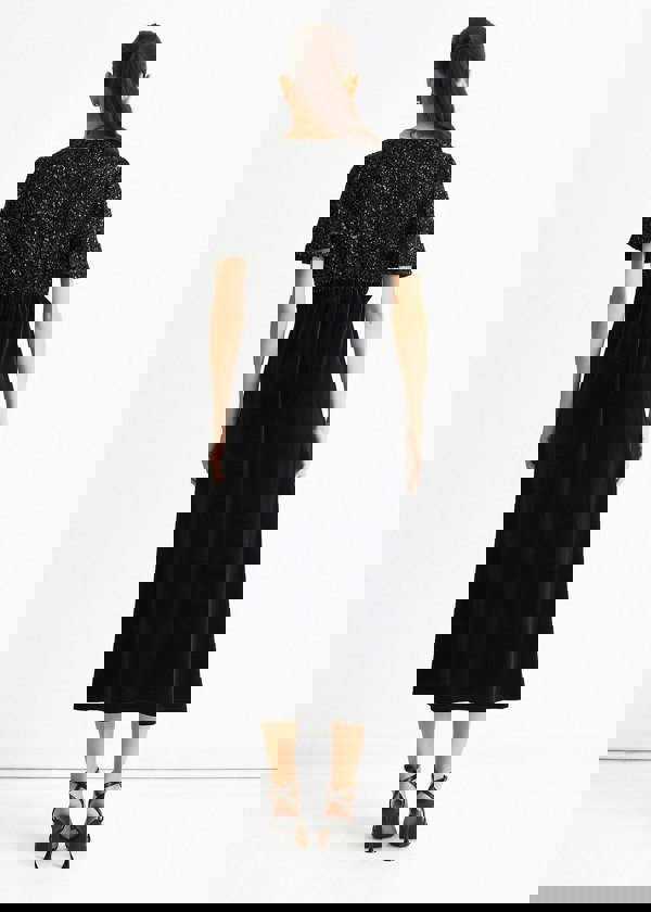 This elegant midi dress features a shimmering black sequin top paired with a soft premium velvet skirt, offering a perfect balance of bold style and comfortable wear. Ideal for special occasions, it lets you make a confident statement while staying relaxed throughout the event.