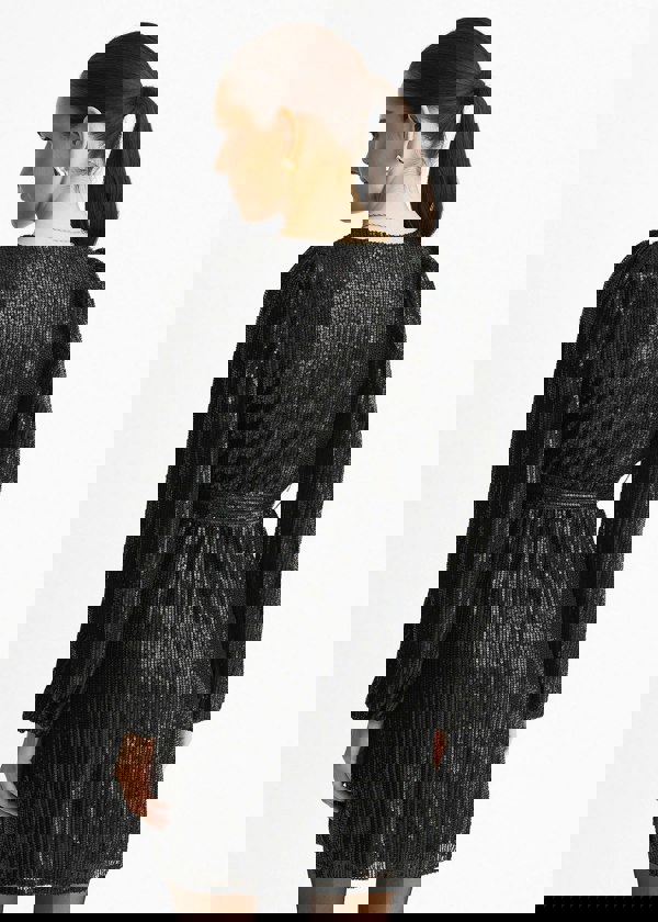 Sparkle and shine in our Black Sequin V Neck Belted Mini Dress. The alluring v-neckline and figure-flattering belted waist add a touch of sophistication. The black sequins give off a glamorous feel, perfect for any special occasion. Elevate your fashion game with this must-have dress.