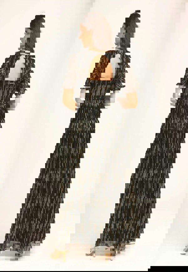 This black dreamy dress is going to steal all of the stares at that upcoming special occasion. Featuring a silver shining printed material with angel sleeve design, side slit and a v neckline wear with lace-up heels for a look we are loving.