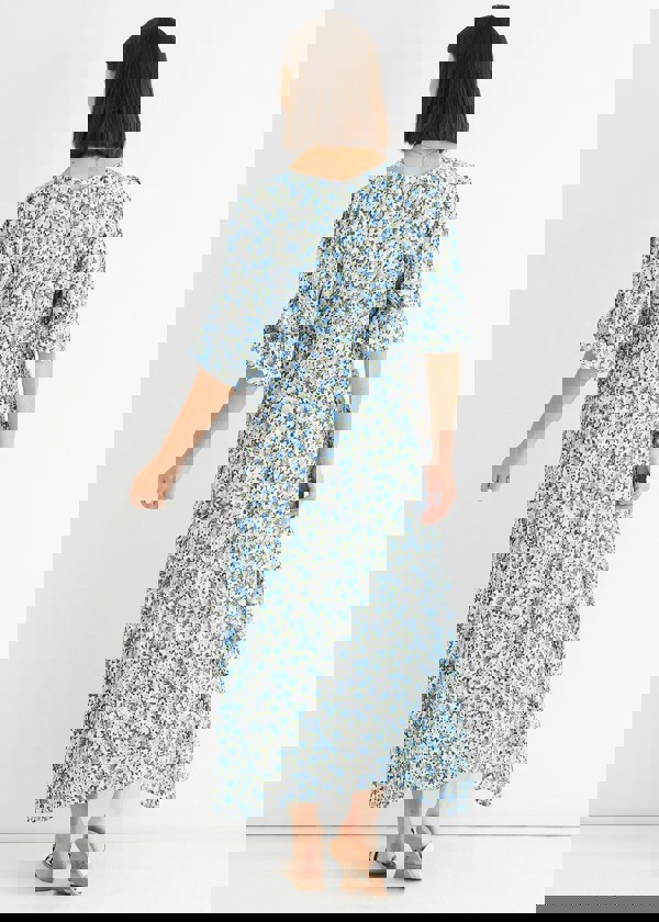This Blue Floral Print Viscose Midi Dress is the perfect addition to your wardrobe. Made with soft and lightweight viscose, it features a beautiful blue floral print that is perfect for any occasion. Comfortable and stylish, this dress is sure to become a go-to piece.
