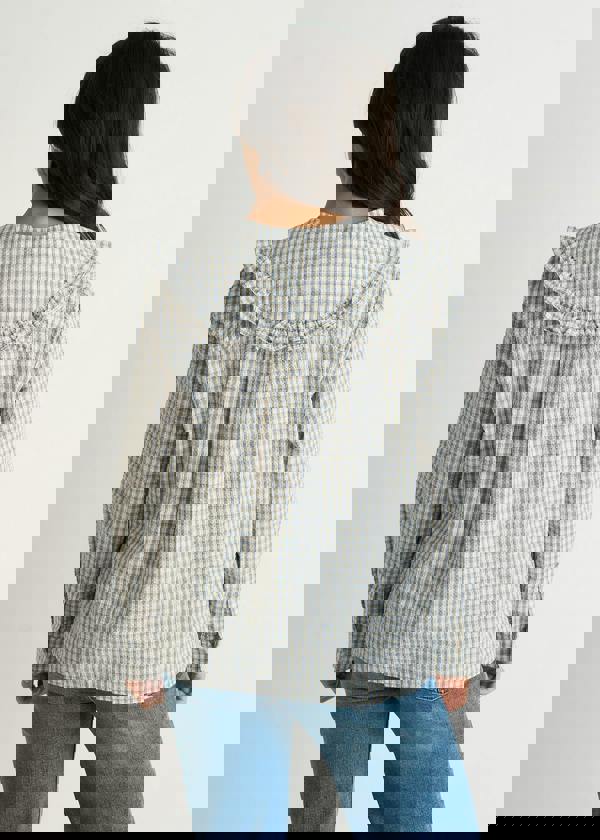 Make a statement with this bold Blue Gingham Shirt, where textured check detailing catches the light with every move. The signature Peter Pan collar adds a daring twist to classic tailoring—sharp enough for standout styling, comfortable enough for all-day wear. Layer it over basics or wear it open for instant edge.