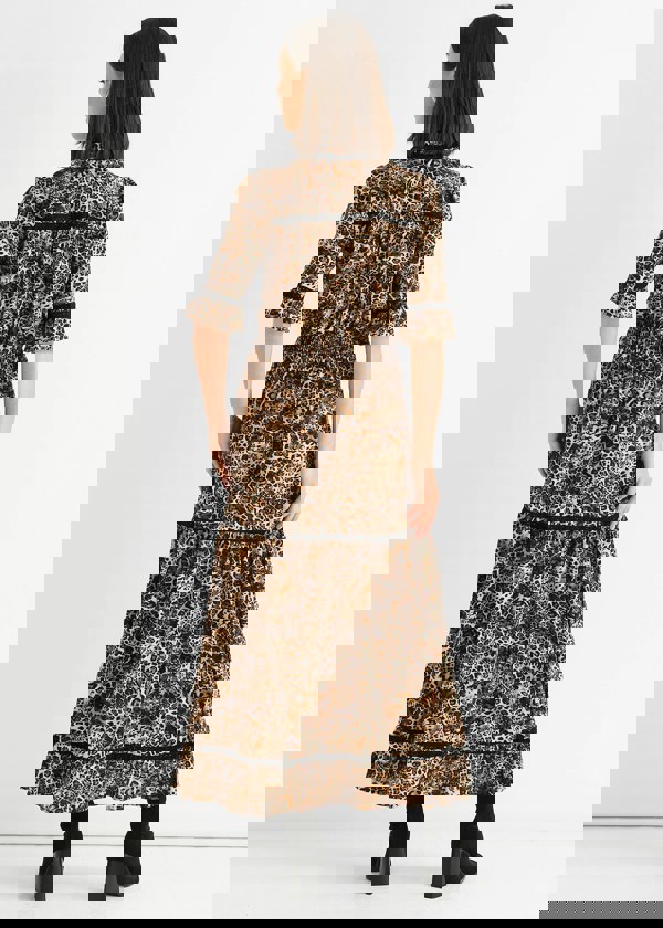 This Brown Animal Print Lace Trim Tiered Midi Dress combines casual comfort with bold style. Featuring a flowing tiered silhouette and delicate lace trim, it offers easy movement and a feminine touch. The striking animal print adds confidence to your everyday look, making it perfect for relaxed yet standout occasions.