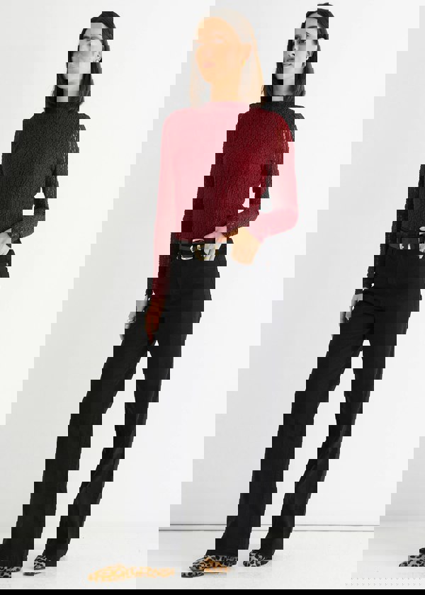 This burgundy top combines casual comfort with bold style. Crafted from soft jersey fabric, it features a high neck and long lace sleeves for a touch of elegance. Perfect for adding a confident, comfortable edge to your everyday wardrobe.